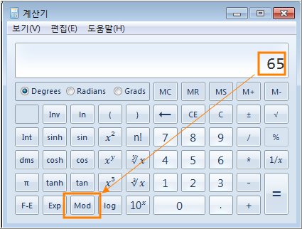 나누어질 숫자인 65를 입력하고 [mod] 버턴을 클릭합니다.