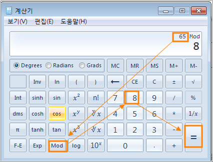 순차적으로 [65] => [mod] => [8] => [=] 을 입력 합니다.