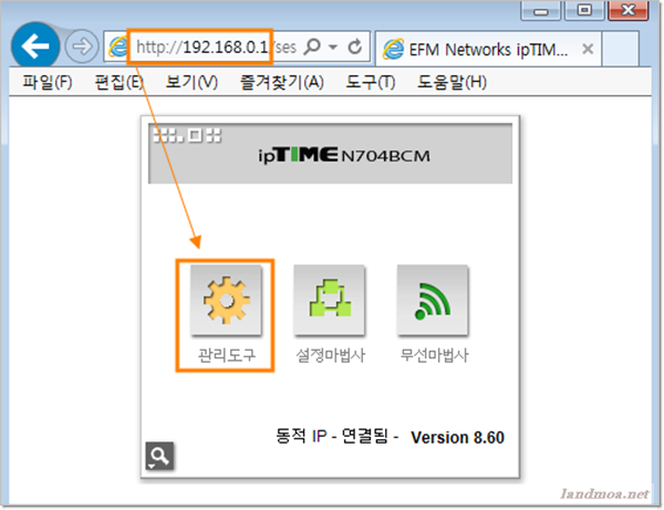 공유기에 접속이 되면 위 그림에서처럼 제일 왼쪽 버턴인 [관리도구]를 클릭합니다.