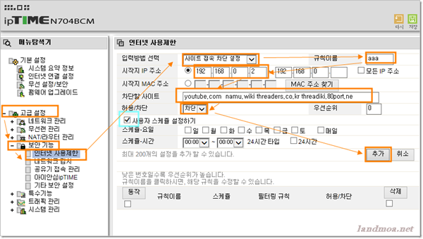 좌측 메뉴에서 [고급설정] =? 보안기능] => [인터넷 사용제한]을 클릭합니다.