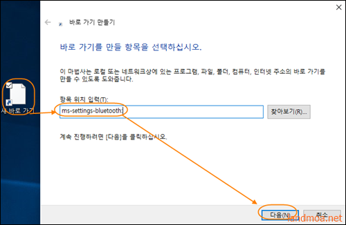 항목 위치 입력란에 [ ms-settings-bluetooth ]를 기재한 다음 [다음] 버턴을 클릭합니다.