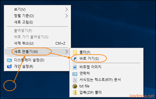 [윈도우즈10]의 바탕화면에서 마우스 우클릭하여 [새로만들기]=>[바로가기]를 클릭합니다.