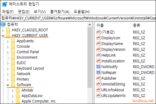 레지스트리 편집기에서 [HKEY_CURRENT_USER] 찾아 [Software] 순으로 찾아 나갑니다.