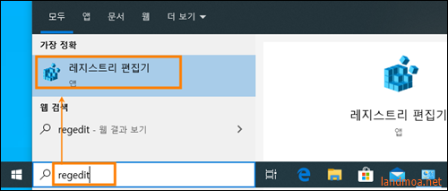 윈도우즈 시작화면의 검색박스에 [regedit]를 입력하고, [레지스트리 편집기]를 실행합니다.