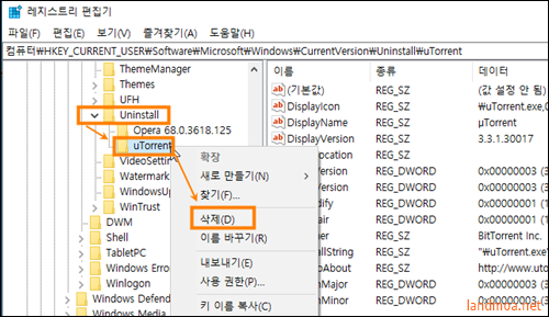 최종적으로 찾은 화면입니다. uTorrent 폴드에서 마우스 우클릭하여 [삭제]를 클릭합니다.