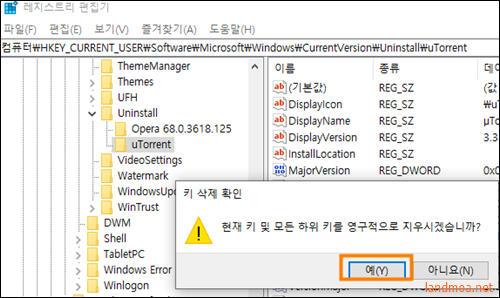 => [예] 를 클릭하시면 uTorrent 는 컴퓨터에서 완전히 지워집니다.