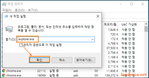 explorer.exe를 기재하고 [확인]버턴을 클릭합니다.
