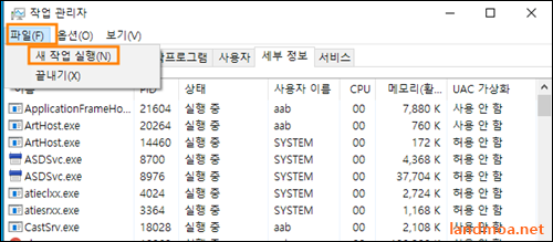 이어 [작업관리자]의 상단메뉴에서 [파일] => [새작업실행]을 클릭합니다.