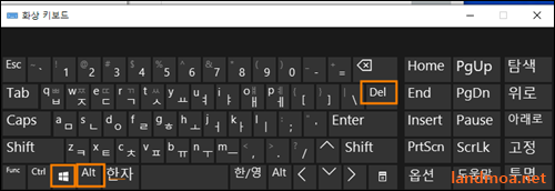 [작업표시줄]이 사라지고 보이지 않는다면, [작업관리자]를 실행하기 위해 키보드에서 [윈도우키] + [ALT] 키를 누른 채로 [del]키를 누릅니다.