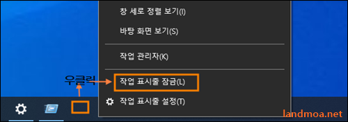 마지막으로 활성화된 하단의 작업표시줄의 빈칸 부분에서 [마우스우클릭]하여 [작업표시줄 잠금]을 체크합니다. 다소나마 부작용으로 인한 작업표시줄 사라짐이 방지됩니다.