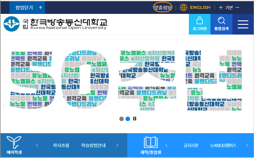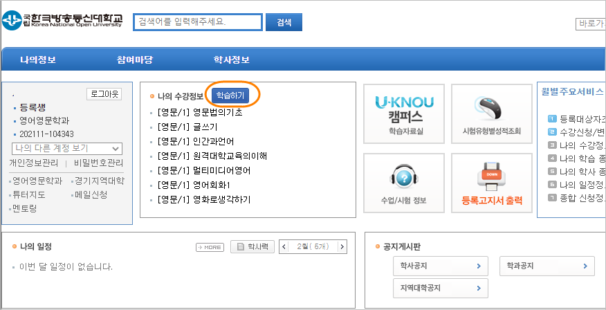 먼저 한국방송통신대학교 홈패이지에 접속한 후 로그인을 합니다.