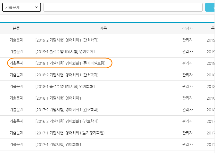 기출문제 중에서 3번째에 있는 [2019-1 기말시험 영어회화 1]을 다운로드 해 봅니다.