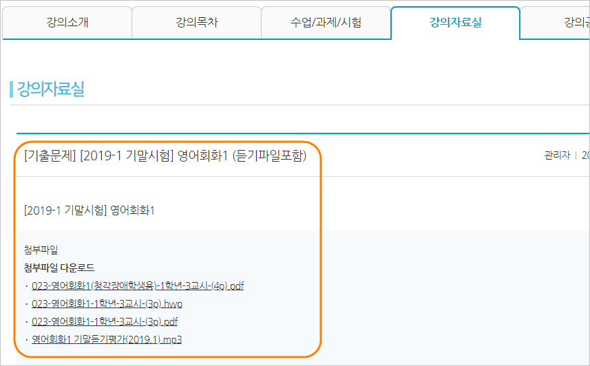 위 그림처럼 기말 시험의 자료들이 문서파일과 소리파일로 제공이 됩니다.
