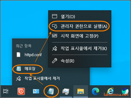 메모장 아이콘에서 우클릭하여 [메모장]을 선택하고, 이어 [관리자권한을 실행]합니다.