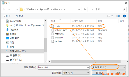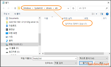 해당 폴드인 c:/windows/system32/drivers/etc/ 에서도 위처럼 아무런 파일이 나타나지 않을 수도 있습니다.