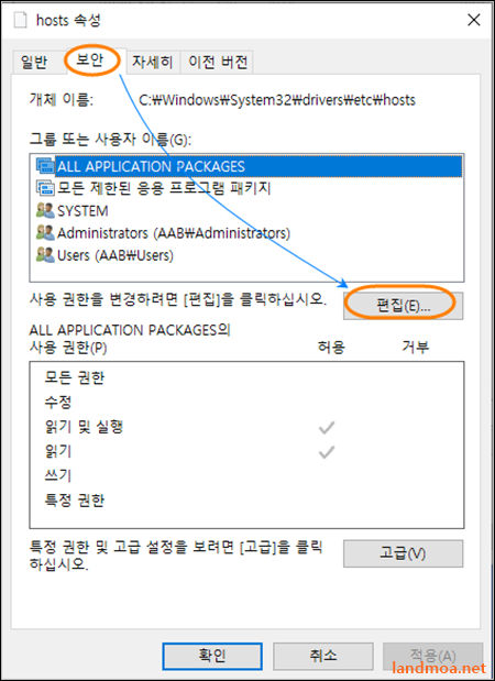 상단 탭메뉴에서 [보안]을 선택하고, 이어 중간 부분에 있는 [편집] 버턴을 클릭합니다.