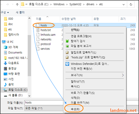 이번에도 [파일탐색기]에서 [hosts] 파일에서 마우스 우클릭하여 [속성]을 선택합니다.