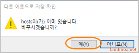다시 hosts파일을 수정해 보고 정상적으로 수정이 되지 않는다면, V3나 알약 등 보안프로그램의 실시간 감시를 해제한 후 작업을 하시면 됩니다.