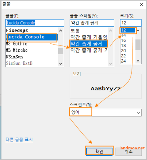 마음에 드는 [글씨체]를 선택한 다음, 글꼴의 [스타일] => [크기]를 선택하고 [확인] 버턴을 클릭합니다.