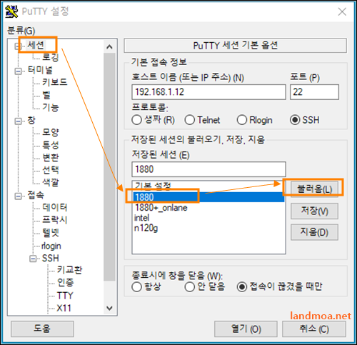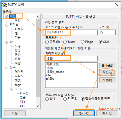 좌측 상단의 [세션]을 선택해 이전에 선택한 값이 맞는지 확인한 다음 =>[저장]버턴을 클릭해 설정값을 저장합니다.