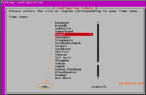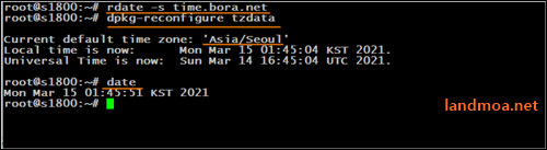 # dpkg-reconfigure tzdata 를 입력하고 엔터키를 누릅니다.
