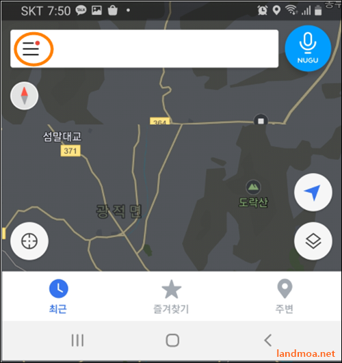 티맵을 실행한 다음, 좌측 상단의 [메뉴] 버턴을 클릭합니다.