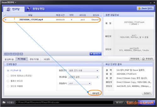 준비된 동영상을 불러왔으면 하단 부분의 [세부설정]을 클릭합니다.
