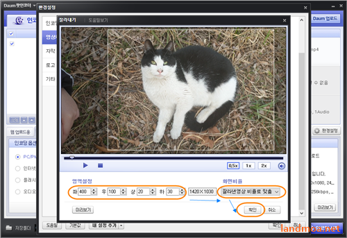 편집할 원본 동영상이 나타나면, 하단 부분의 영역설정에서 좌우 상하에 원하는 숫자를 기입합니다.