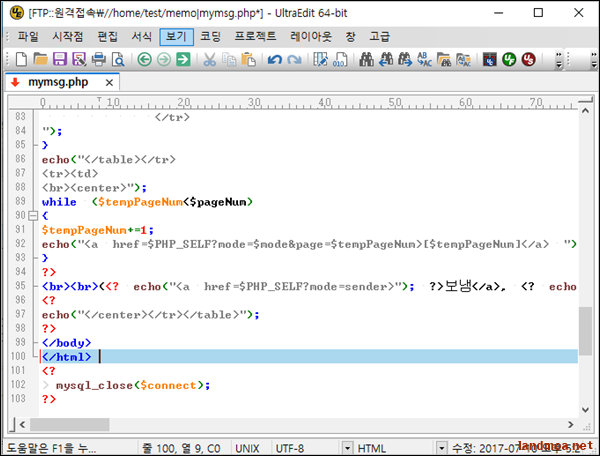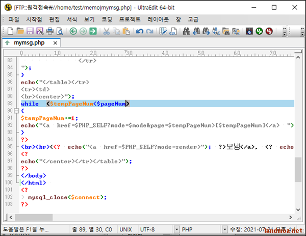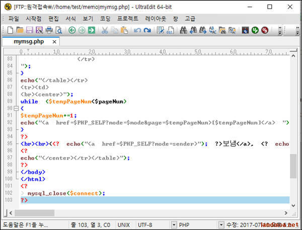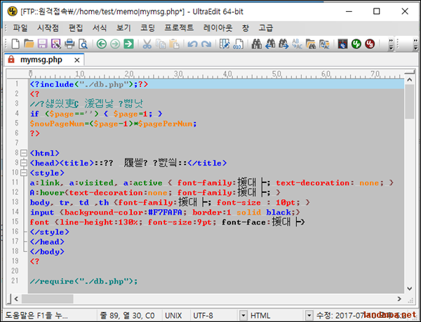 원격서버의 /home/test/memo/mymsg.php 파일을 울트라 에디터로 열람한 모습입니다.