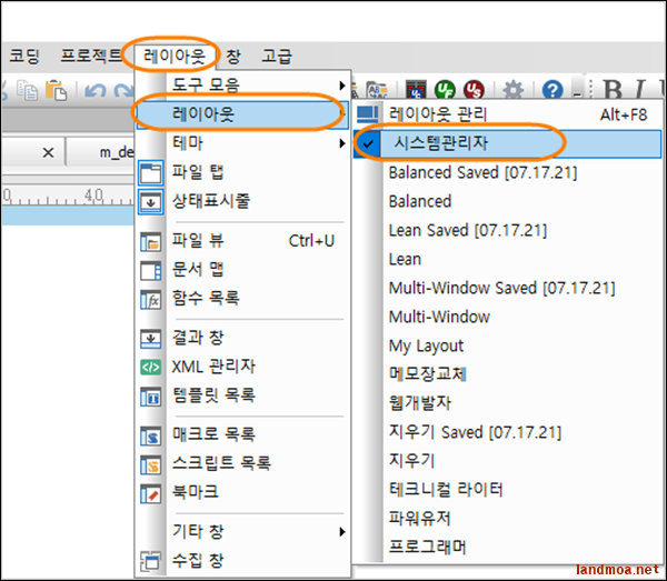 울트라에디터에서 레이아웃을 [시스템관리자]로 선택합니다.