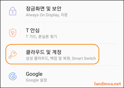 [클라우드 및 계정]를 선택합니다. 이 부분은 스마트폰의 기종마다 차이가 있을 수 있습니다. [사용자 및 계정]으로 된 경우도 있고, [계정]으만 표시된 경우도 있습니다. 같은 항목이 없으면, 유사한 항목을 선택해 확인해 보시기 바랍니다.