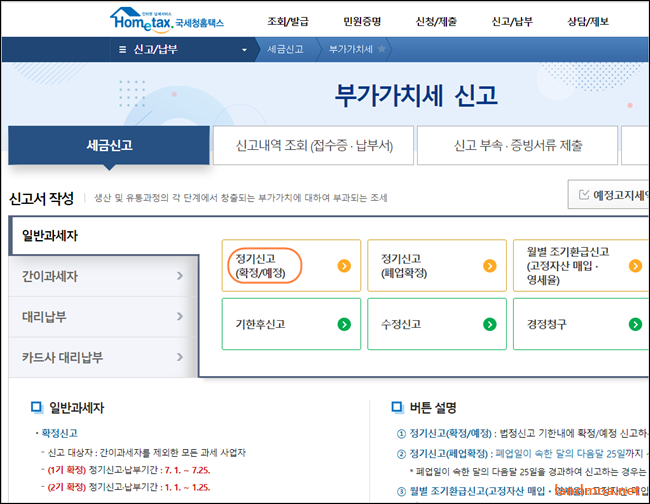 [부가가치세 신고] 항목에서 [일반과세자]에서 [정기신고(확정/예정)]를 선택합니다.