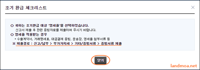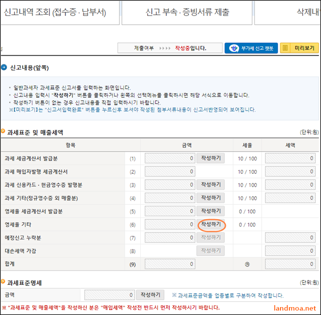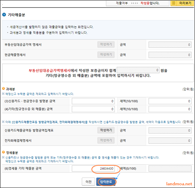 참고로, 유튜브나 애드센스 수입은 별도로 세금계산 등을 발행하지 않으니 신경쓰지 않으셔도 됩니다. 외환수입은 영세율이 적용되므로 위 그림처럼 세액은 0%로 나옵니다. 입력이 끝났으면 [입력완료] 버턴을 클릭합니다.