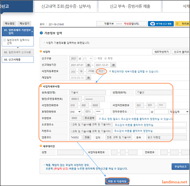 자신이 운영하는 사업자 등록번호를 선택한 다음 [확인] 버턴을 클릭합니다. 하단에 있는 상호, 대표자 성명, 주소 등 사업장에 대한 세부내역이 자동으로 기재가 됩니다. 이상이 없는지를 확인한 다음, 하단에 있는 [저장후 다음이동] 버턴을 클릭합니다.