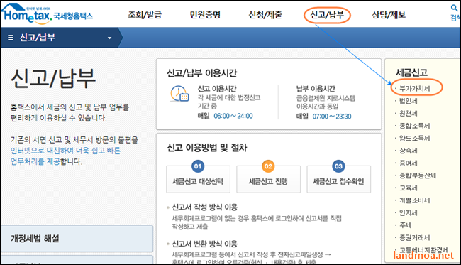 상단메뉴 [신고납부] => [부가가치세]를 선택합니다.