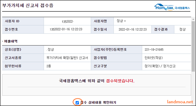 부가가치세 신고세가 접수되었다는 메시지입니다.