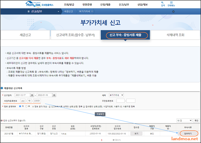 부가가치세 신고를 하기 위해서는 은행을 들려 발급받은 [외환매입/예치증명서]를 첨부해야 합니다. 위 화면의 우측하단 부분에서 부속서류 [첨부하기]를 클릭합니다.