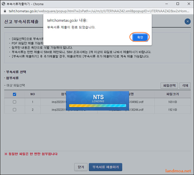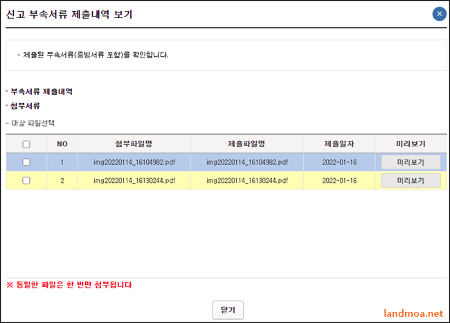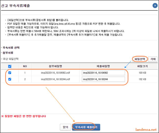 [파일선택]을 클릭하셔서 두장의 파일을 모두 올리시면 됩니다. PDF파일로 변환이 힘드시면 jpg 나 png 파일 등 이미지 파일로 올리셔도 됩니다. 파일이 선택이 되었으면 [부속서류 제출하기] 버턴을 클릭합니다.
