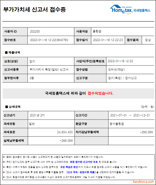 [부가가치세 신고서 접수증]을 출력해 본 결과물입니다. 접수번호와 날짜, 과세표준과 세액 등이 표시되어 있습니다.