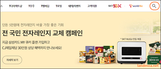 위 링크를 클릭하여 티월드 홈페이지로 접속을 합니다. 우측 상단 부분의 돋보기 모양의 검색버튼을 클릭합니다.