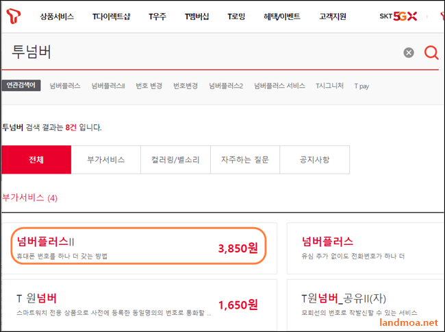 검색창에서 [투넘버]를 입력하고 엔터키를 누릅니다. 하단 검색자료에서 [넘버플러스ii]를 선택합니다. 참고로, 새번호를 추가하시면 3850원의 비용이 발생합니다.