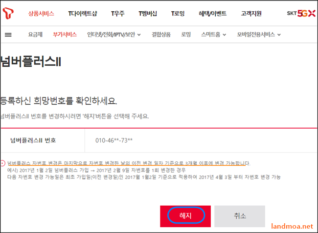 [넘버플러스ii]의 전화번호와 3개월 후에 번호 변경이 가능하다는 안내메시지가 나옵니다. [해지] 버튼을 클릭합니다.