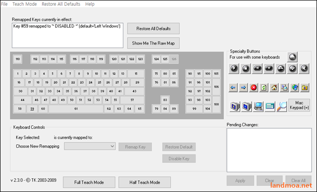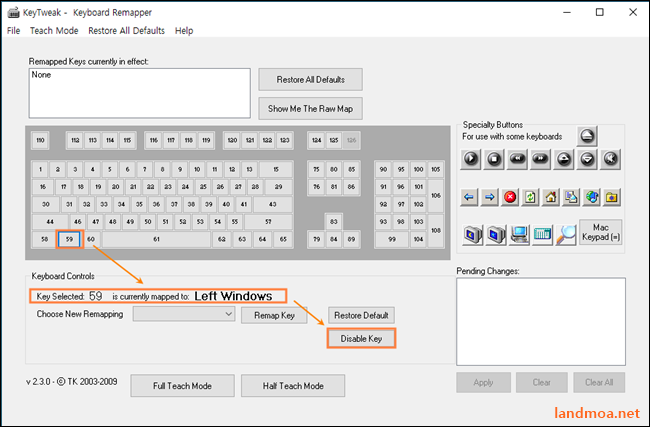제어된 키보드를 재 활성화 시키려면, 비활성화 된 키를 선택을 하고 바로 아래에 있는 [Restore Default]를 누르시면 윈도우즈키가 복구됩니다.