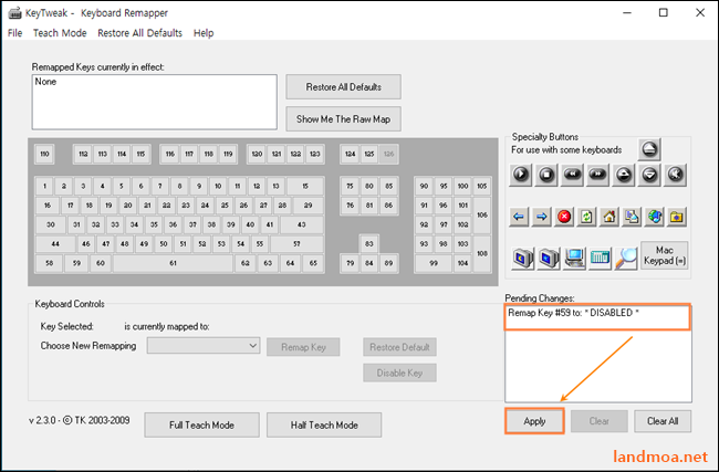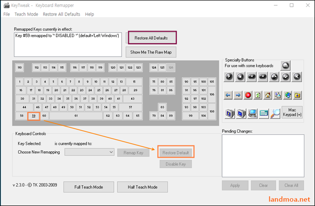 만약, 여러 개의 키를 제어한 경우는 상단 중앙에 있는 [Restore All Default]키를 누르시면 됩니다.