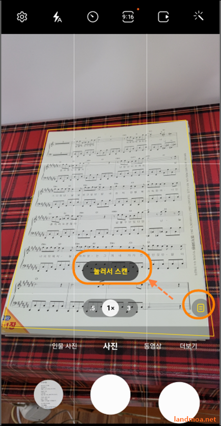 실감이 좀 더 나는 피아노 악보를 스캔해 봅니다. 역시 기본적인 윤곽 화면에서 문서 아이콘을 터치한다음 [눌러스스캔]을 터치하고 [저장버턴]을 눌러 악보 스캔을 마칩니다.