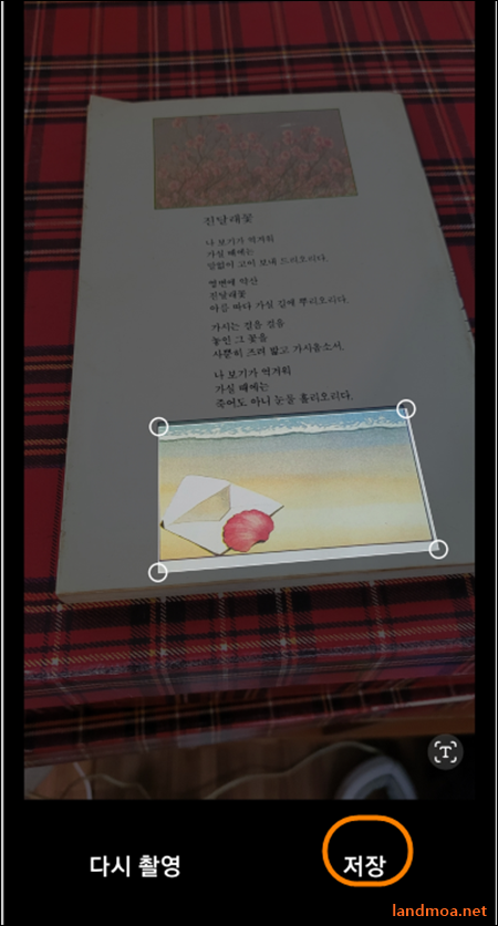 해당 문서의 모서리 부분을 중심으로 선택상자를 이동할 수 있는 커서가 나타납니다. 자신이 원하는 크기로 다시 수정할 수 있습니다. 스캔할 문서의 범위가 정해 졌으면 최종적으로 [저장]을 클릭합니다.