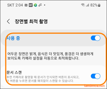 [장면별 최적촬영]을 선택한, 다음 세부 화면에서 [문서스캔]도 선택해 주셔야 합니다.