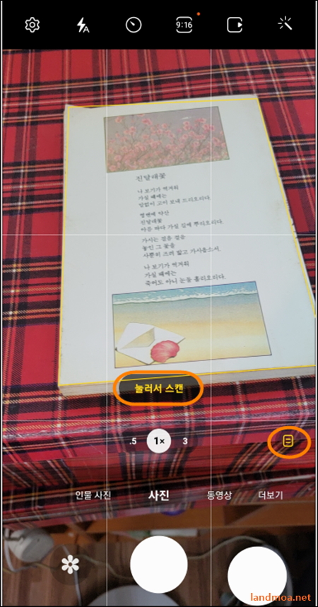 위 화면은 책의 표지 부분을 촬영한 화면입니다. 참고로, 스캔할 문서와 바탕화면은 대비가 클 수로 좋습니다. 구도와 초점을 맞추는 화면에서 문서모양의 아이콘을 선택하면, 해당 문서에 노란색으로 테두리가 보입니다. [눌러서 스캔]을 터치합니다.