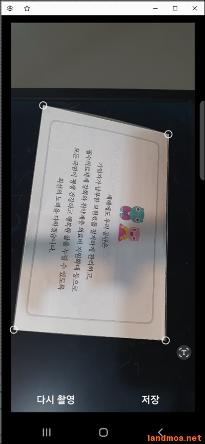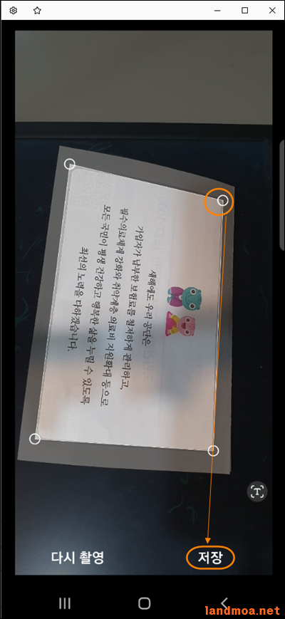 촬영이 막 끝난 원본 사진입니다. 문서로 인식한 부분의 모서리에 작은 원들이 생긴 것이 보입니다., 이 원들을 클릭해 자신이 원하는 영역을 만드시면, 해당 영역의 화면만 사진으로 저장이 됩니다.