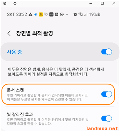 [장면별 최적촬영]이 사용중으로 활성화되고, [문서스캔] 기능 역시 활성화 되어야 합니다.
